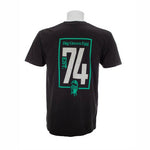 100% cotton. Black standard-fit, short-sleeve t-shirt with “Est ’74” message on reverse